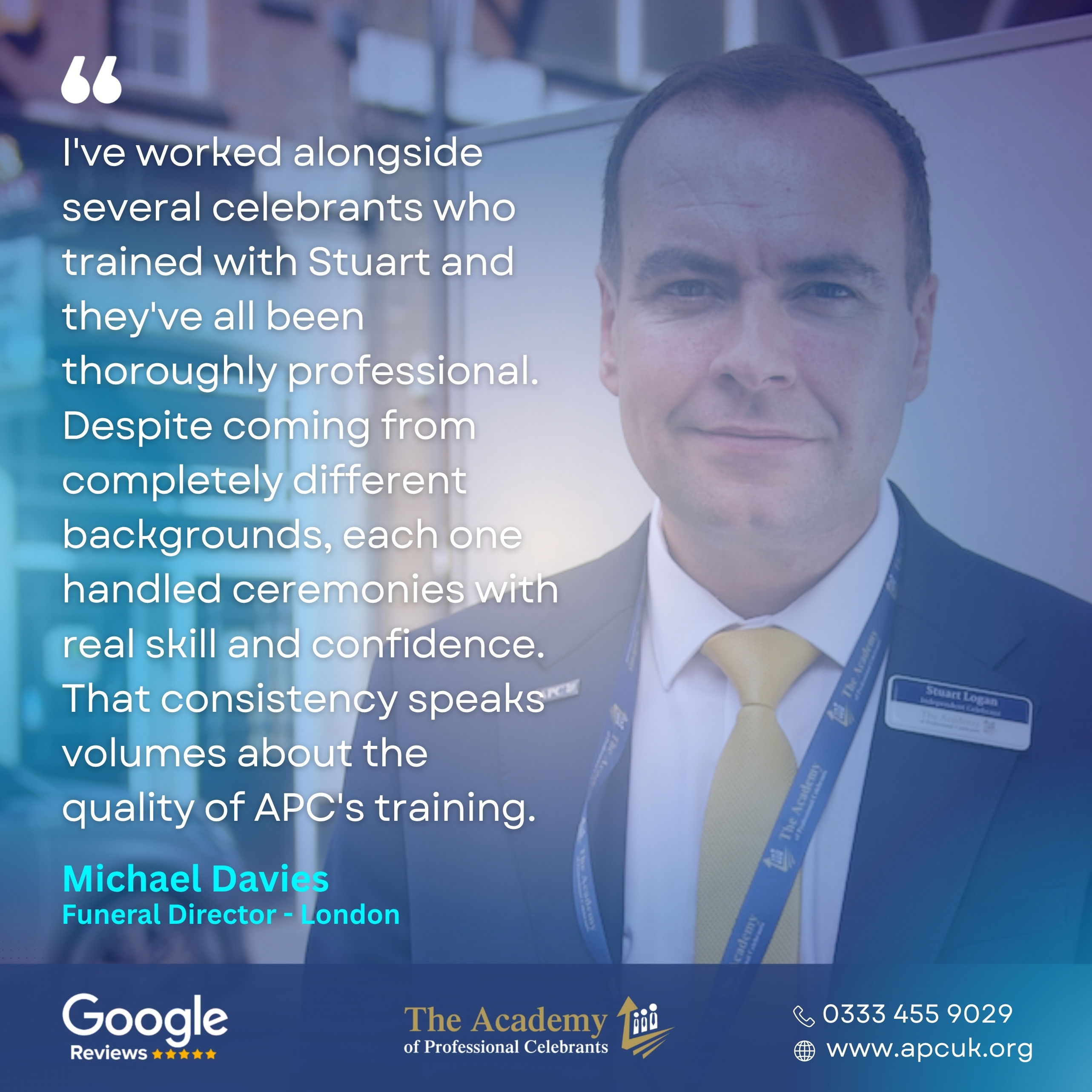 Stuart delivered my Funeral Celebrant training which was excellent in itself, he was clear, approachable and made the course interesting and informative and i was really impressed with the resources that are also provided - but - what mattered even more was the aftercare that has been provided. I was asked to conduct quite a difficult funeral and Stuart supported me throughout, providing advice, taking a look at my service and also checking in with me after the funeral. I would recommend APC to anyone who is looking to embark on their funeral celebrant training journey